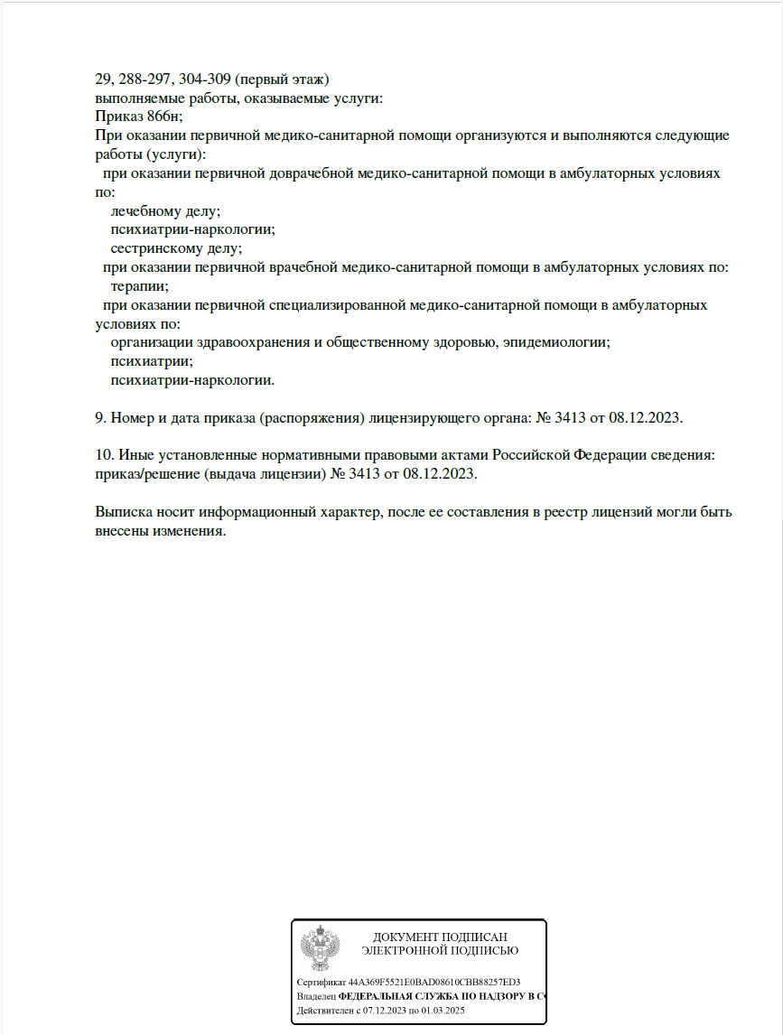 Во время лечения пациент получает консультации врачей из разных областей медицины по показаниям. Данные не заносятся в его амбулаторную карту, поэтому за пределами клиники никто не узнает о лечении пациента у нарколога.